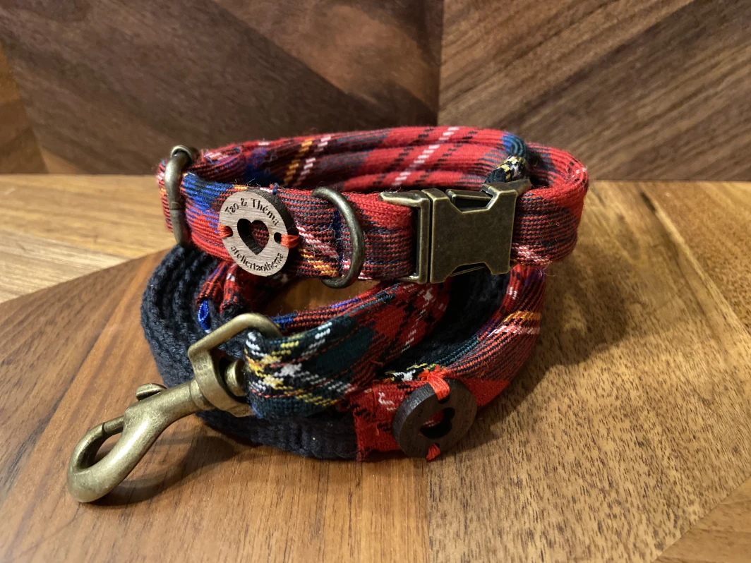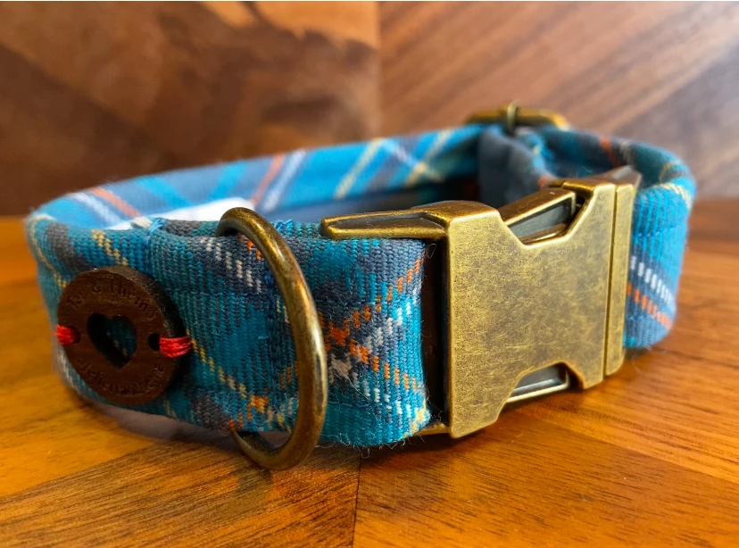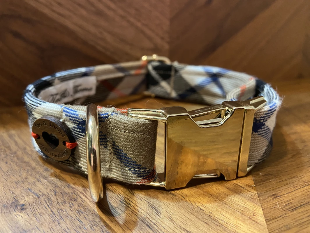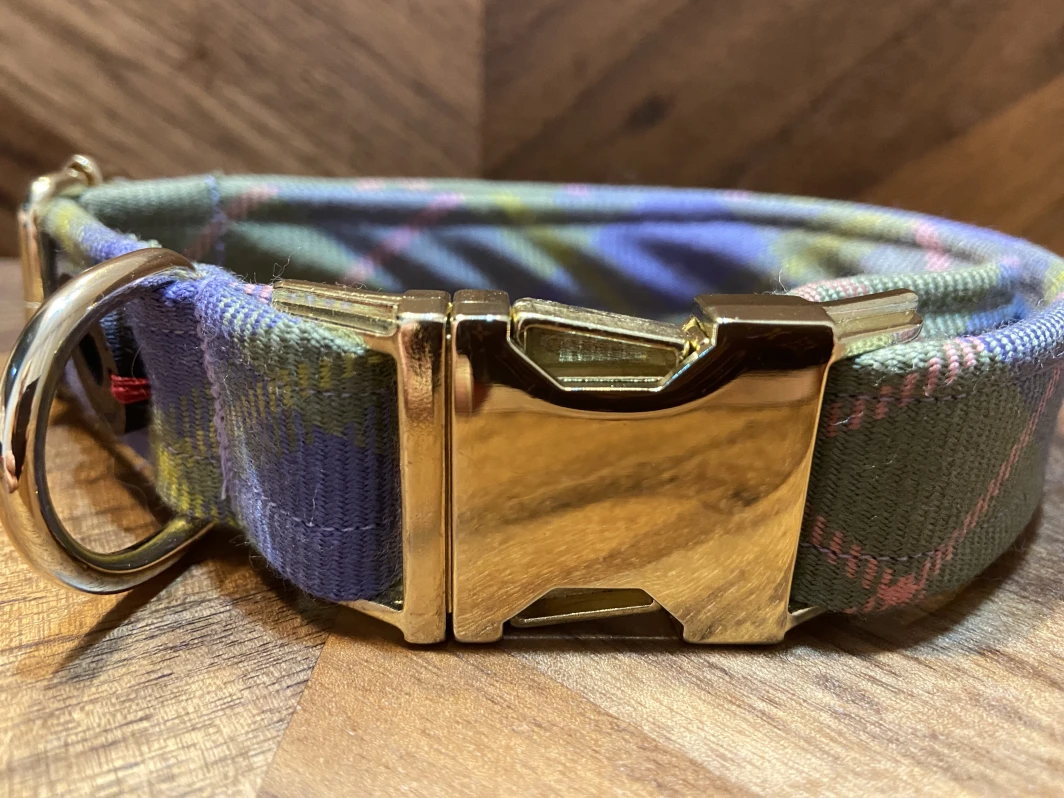 Élégants, confortables et de grande qualité, tous les colliers sont réglables, ils sont fabriqués à la main en France avec du Tartan d'Écosse Pur Laine 10oz, de premier choix, cousu sur sangle coton et fermés par des boucles en métal massif de haute qualité.