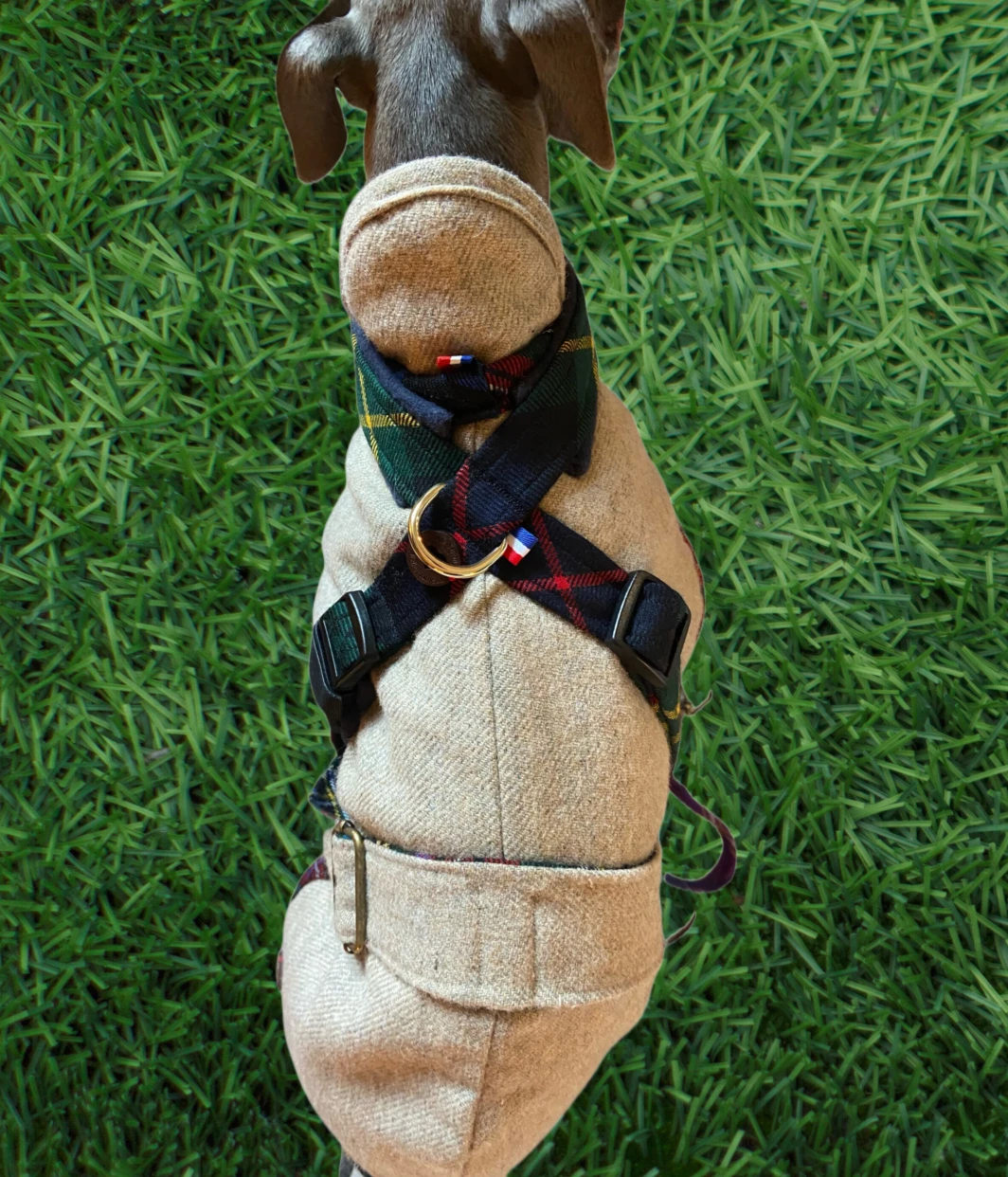 Les manteaux,spécialement conçus pour Le Petit Lévrier Italien frileux sont fabriqués sur-mesure en Tweed d'Écosse Pur Laine doublé d'un tissu polaire.
